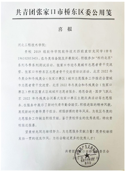 近日,共青团张家口市桥东区委员会向beat365官网发来喜报:beat365官网2019级软件技术四班袁世龙同学积极参加张家口市迎冬奥志愿者系列活动,表现优秀,特向beat365官网报送报喜。