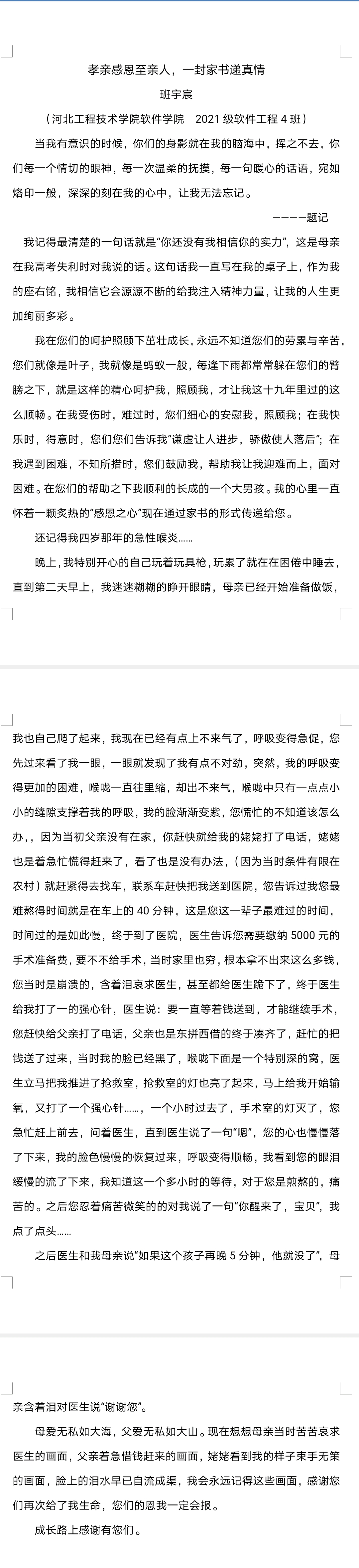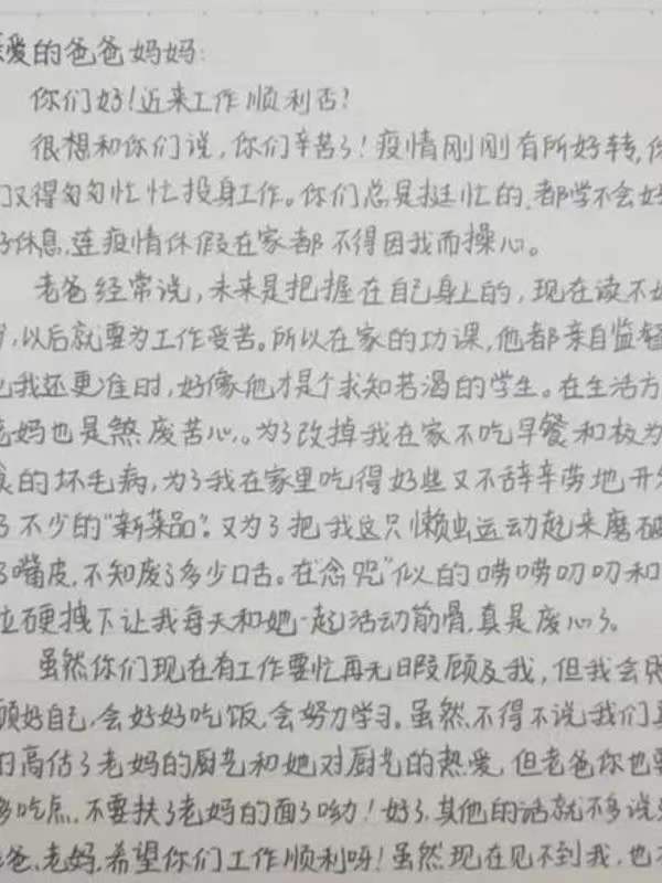 3.“爸,妈你们对我无私的恩情,我无法用笔记录下来,但是我一定铭记心中,永远不忘你们对我的恩情。我写不出优美感人的语言,但我拿起笔有千言万语要写下来。爸妈,辛苦了!”——21软件工程1班 高佳星
