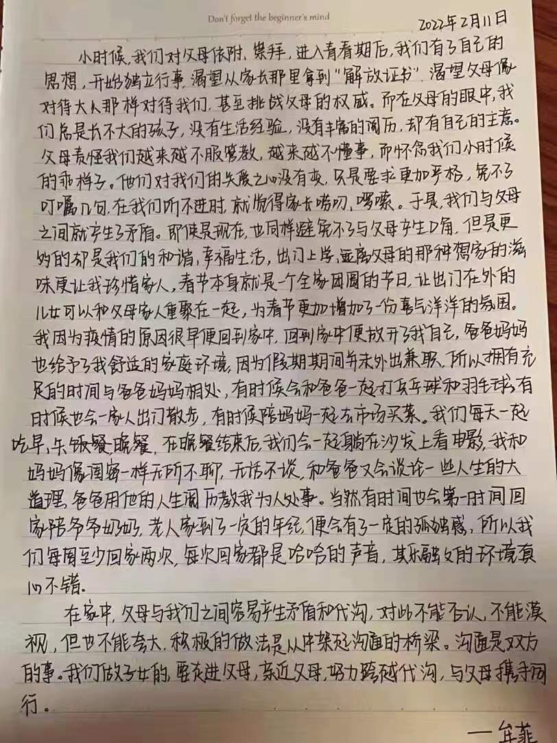 2.“长大以后才知道,和父母也可以成为最好的好朋友啊。可以无话不谈,可以分享有趣的事,可以互相敞开了心扉抱怨吐槽,可以永远当被保护的那一个。”——21网络安全1班 单宇祺