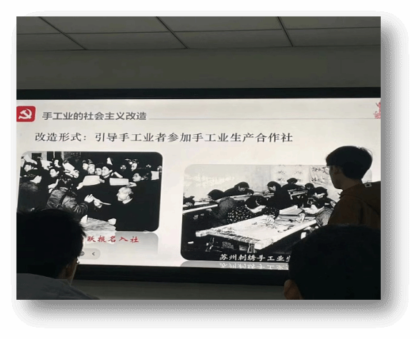 软件工程六班的何宗鑫同学给大家讲述了三大改造从 1952 年下半年开始,到 1956 年结束,在政治意义上完成了对农业、手工业和资本主义工商业的社会主义改造,实现了把生产资料私有制转变为社会主义公有制。