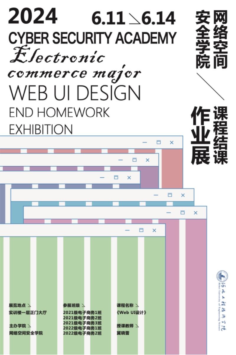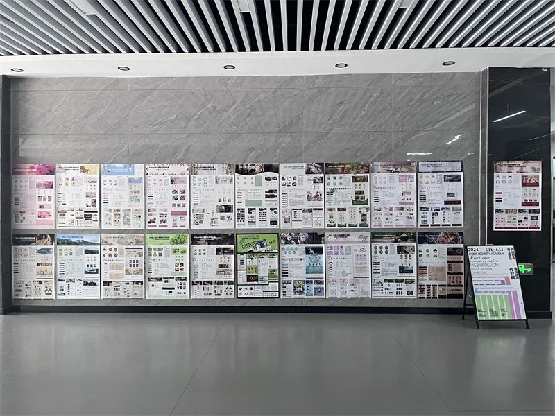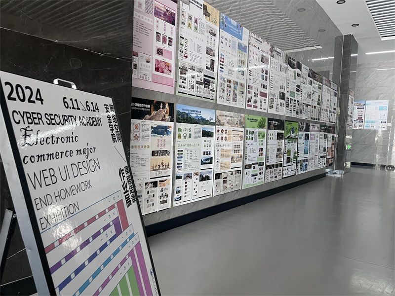 6月11日-6月14日,beat365英国官网网站电子商务专业在践行楼一层大厅举办了冀晓蕾老师的《Web UI设计》结课作品展,设计主题不限,以学生兴趣点作为设计主题的出发点,充分发挥学生自主能动性。学生通过前期调研确定主题、设计布局、分析色彩和字体、设计制作功能图标、设计制作网页界面、设计展板等八大模块进行学习与实践。本次展出作品来自2021级、2022级电子商务专业共5个班,从近200份作品中挑选出42份优秀作品进行展示。