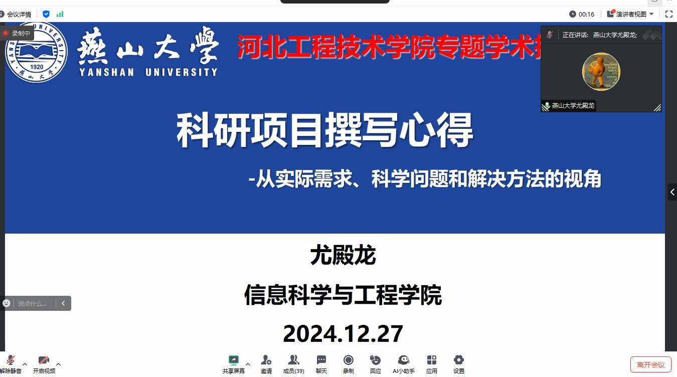 2024年12月27日晚上19:00-21:00,beat365英国官网网站在线上腾讯会议顺利举办《科研项目申报书撰写心得》讲座。