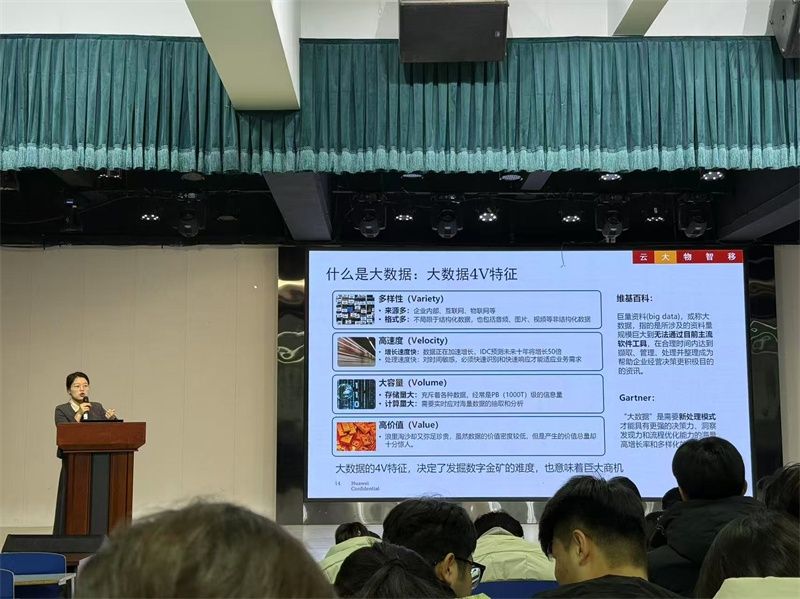 讲座中,胡瑶老师首先从“大数据”入手,详细阐释了其“4V”特征——多样性(Variety)、高速度(Velocity)、大容量(Volume)与高价值(Value),并结合实际案例说明大数据如何成为智能决策与业务优化的核心驱动力。随后,胡瑶老师介绍了华为自主研发的鸿蒙系统(Harmony OS),强调其作为面向万物互联时代的分布式操作系统,具备一次开发、多端适配的独特优势,可支持手机、汽车、穿戴设备等多类终端,实现无缝协同体验。