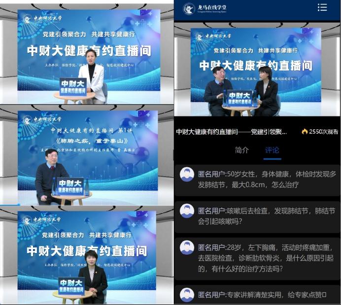 健康路上,你我同行。中财大健康有约直播间通过党建引领、共建共享、云端互动的形式,携手权威专家、健康达人为全校师生提供专业、实用、有趣的健康知识。未来中财大健康有约直播间将发挥“小科普、大健康”的作用,让优质的医疗科普内容广泛有效地触达到每位师生,为师生健康护航!