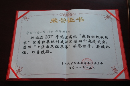12月11日,2011年由北京市教工委主办的北京高校“我的班级我的家”优秀班集体创建评比活动在北京化工大学举行,我校必赢nn699net官网08精算班荣获北京市“十佳示范班集体”荣誉称号。
