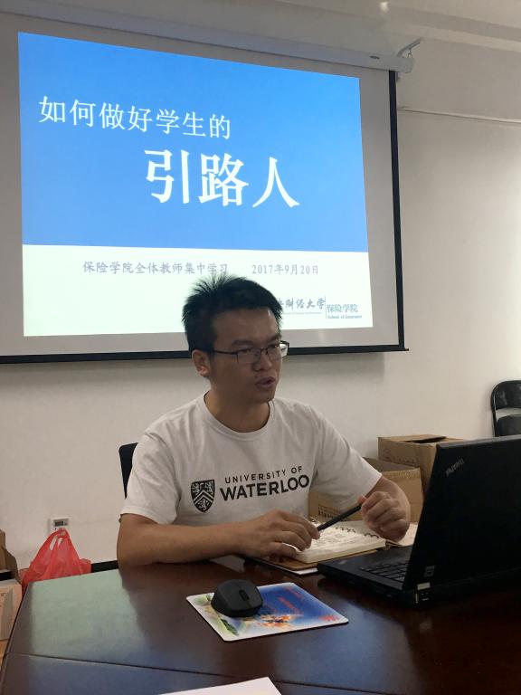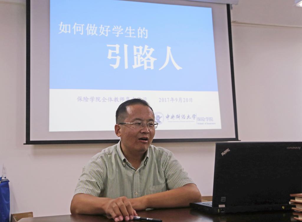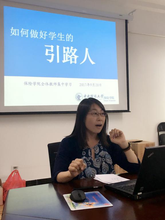 在主题发言环节,副院长徐晓华老师跟大家分享了自己的教学心得,他希望所有教师都要保证足够的精力投入到和学生的交流中,多给学生学习生活上的引导,老师不仅仅为学生传授知识,更应该引导学生树立正确的价值观。北京市教学名师、保险系许飞琼老师从自己对待学生的例子出发,讲述了如何引导学生正确看待保研、就业、处理同学关系的问题,要在与学生的日常交往中传授“吃亏是福”、先天下之忧而忧”的思想。社保系的刘钧老师讲述了自身求学工作经历中,她与三位终生难忘的老师的故事,她一直以那些老师为榜样,心系学生,自己的目标就是要成为学生一生中印象最深刻的老师。精算系的池义春老师从和学生学术沟通的角度谈了如何做学生引路人的理解,他提出教师和学生之间要互相尊重,多鼓励学生思考,教师们要学会挖掘学生的优点和长处。辅导员才立琴谈到,教师是实现中华民族的中坚力量,所以引路人非常重要,在座的老师都应该有这个担当,做一个好的引路人之前,老师们要先自我提升,做“四有”好老师。以上五位老师从不同角度,以各自的方式诠释了“如何做好学生引路人”,深受启发。