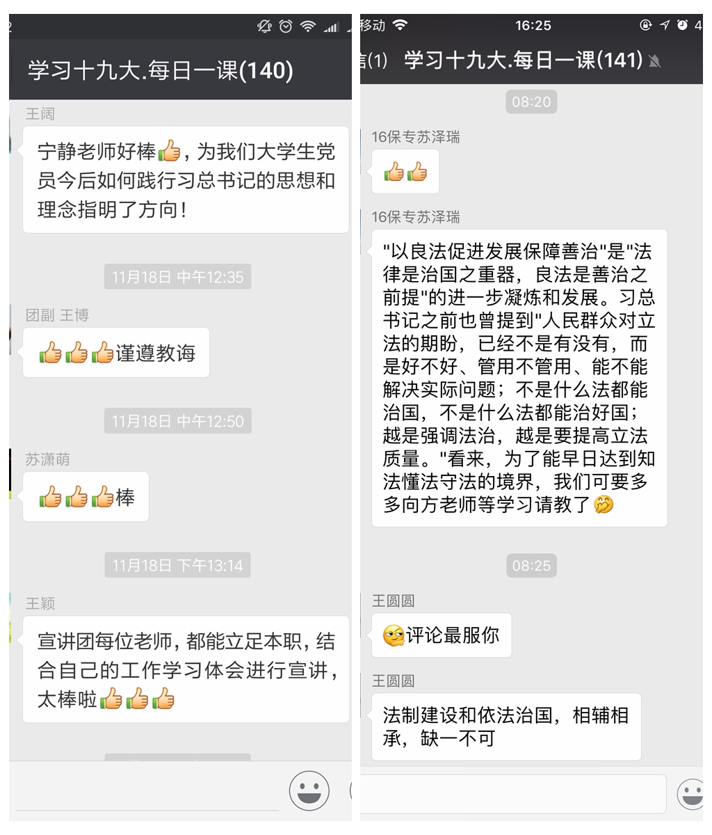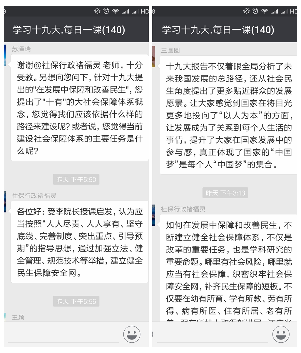 在宣讲的同时,群里的党员们也对宣讲内容深入思考,积极踊跃地发表自己的学习感想,在微信群里进行分享和讨论交流。其中,王圆圆在发言中说,党的十九大报告不仅着眼全局,分析了未来我国发展的总路径,还从社会民生角度提出了更多贴近群众的发展愿景。让大家感觉到国家在将目光更多地投向了“以人为本”的方面,让发展成为了关系到每个人生活的事情,提升了大家在国家发展中的参与感,真正体现了国家的中国梦是每个人中国梦的集合。师生党员们纷纷在群里表示赞同并表达了对中国梦的看法。紧接着,褚福灵老师在群里分享了有关“如何在发展中保障和改善民生,不断建立健全社会保障体系”的想法,他认为不仅要在幼有所育、学有所教、劳有所得、病有所医、老有所养、住有所居、弱有所扶上取得新进展,还应当在灾有所援、贫有所帮、冤有所诉等方面取得新进展,建立起基于“十有”得大社会保障体系。发表想法后,党员们表示赞同也有人表示疑惑,比如,苏泽瑞针对褚福灵老师提出的“十有”的大社会保障体系概念,在群里向褚福灵老师提问“当前建设社会保障体系的主要任务是什么”。褚福灵回答说应当按照“人人尽责、人人享有、坚守底线、完善制度、突出重点、引导预期”的指导思想,通过加强立法、健全管理、规范技术等举措,建立健全民生保障安全网。微信群中的讨论十分积极热烈,针对各类问题大家纷纷深入探讨,收益颇丰。