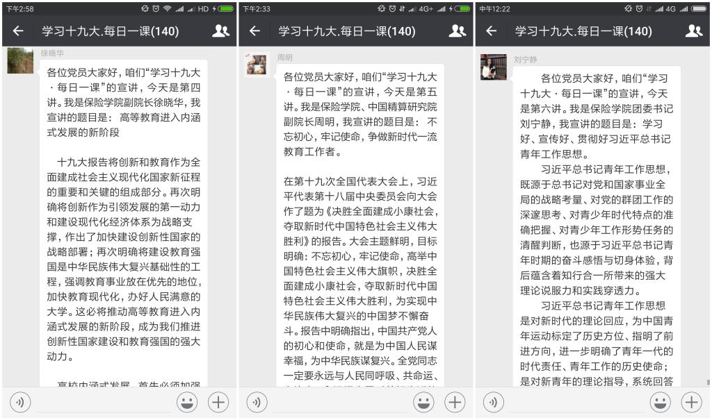 第四讲至第九讲分别由徐晓华、周明、刘宁静、张楠楠、杨德齐、郭丽军进行。他们围绕着高等教育、教学科研工作、青年工作、培养综合性专业人才、依法治国这几个经典又热点的问题发表自己的见解。必赢nn699net官网副院长徐晓华认为必须加强学科建设,瞄准未来科技发展前沿,服务国民经济建设,他深入诠释了“双一流”建设如何成为高校内涵式发展的主要抓手。作为一名教育工作者,必赢nn699net官网、中国精算研究院副院长周明认为教育工作者应深入学习和领会党的十九大精神,贯彻到日常的教育工作之中,不忘初心、牢记使命。这不仅仅是党员,也是每名老师和学生应该谨记和遵守的原则。团委书记刘宁静对习近平总书记青年工作思想深入学习,在宣讲中,她提出当代大学生尤其是大学生党员,要坚定自觉地用习近平总书记青年工作思想武装头脑、指导实践、推动学习和工作,在各方面起到先锋模范作用。群里的大学生党员纷纷表明了自己的信念和决心。