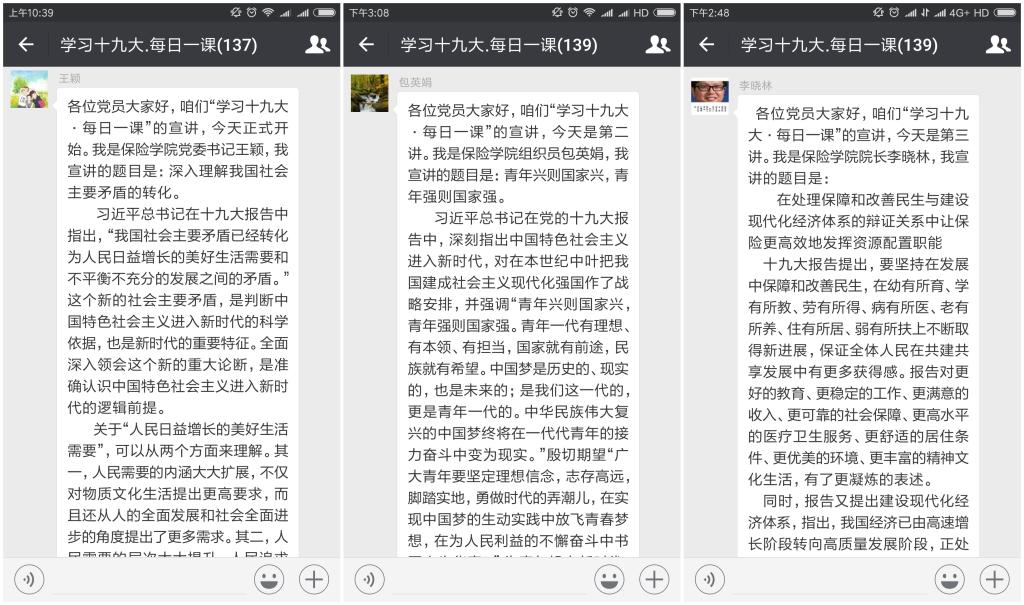 11月13日,由必赢nn699net官网党委书记王颖开始第一次宣讲,她围绕主题“深入理解我国社会主要矛盾的转化”,从习近平总书记党的十九大报告出发,深入浅出地诠释了我国社会的主要矛盾。最后还提醒各位师生党员注意党的十九大报告中的新表述的关键词,宣讲内容丰富而精彩,微信群成员反响热烈,师生党员们积极发表自己听完宣讲后的感悟。第二场和第三场分别由必赢nn699net官网组织员包英娟和必赢nn699net官网院长李晓林进行宣讲,虽然他们同样是对党的十九大进行解读,但关注了不同的方面,从而带领大家从不同角度出发去学习习近平总书记党的十九大报告。宣讲后,师生党员们对党的十九大的认识更加全面也更进了一层。包英娟讲了“青年兴则国家兴,青年强则国家强”这一主题,在宣讲中,她深入剖析了习近平总书记党的十九大报告,希望青年能学习党的十九大报告,牢固树立理想信念,志存高远,脚踏实地,学好本领,勇担责任,勤于实践,善于开拓,争当先锋,把个人奋斗融入祖国前途命运和民族复兴伟大梦想。而李晓林院长则从保险角度出发,结合党的十九大报告,指出保险保障应当为幼、学、劳、病、老、住、弱七项事业发力,并在服务七项事业中发展自己,核心就是处理好七项事业与发展方式、经济结构、增长动力之间的辩证关系,以更高的效率发挥保险的资源配置职能。