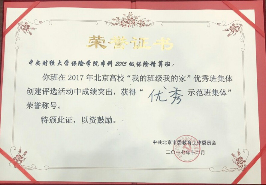 “精通运筹燃梦想,算达天下展芳华”,精算15班认真贯彻十九大精神,围绕“青年责任、保险担当”的班训积极推进班级思想建设、文化建设、学风建设、班级队伍建设,形成了忠诚爱党、学术精进、团结创新的班级文化。精算15班忠诚爱党,发扬模范先锋作用,班级现有预备党员5人,积极分子13名;追求进步,成就卓越,班级获“优团计划”首都高校优秀基层团组织、校五四红旗团支部(2次)、校十佳先锋班集体;开拓创新,力争上游,23人次获得国家级奖项,26人次获得省部级奖项;班级加权平均分达86.03;在核心期刊发表论文2篇、学术论坛发表论文9篇;热心公益,砥砺奋进,班级同学参加志愿活动小时数达900,参加主题教育活动23次。