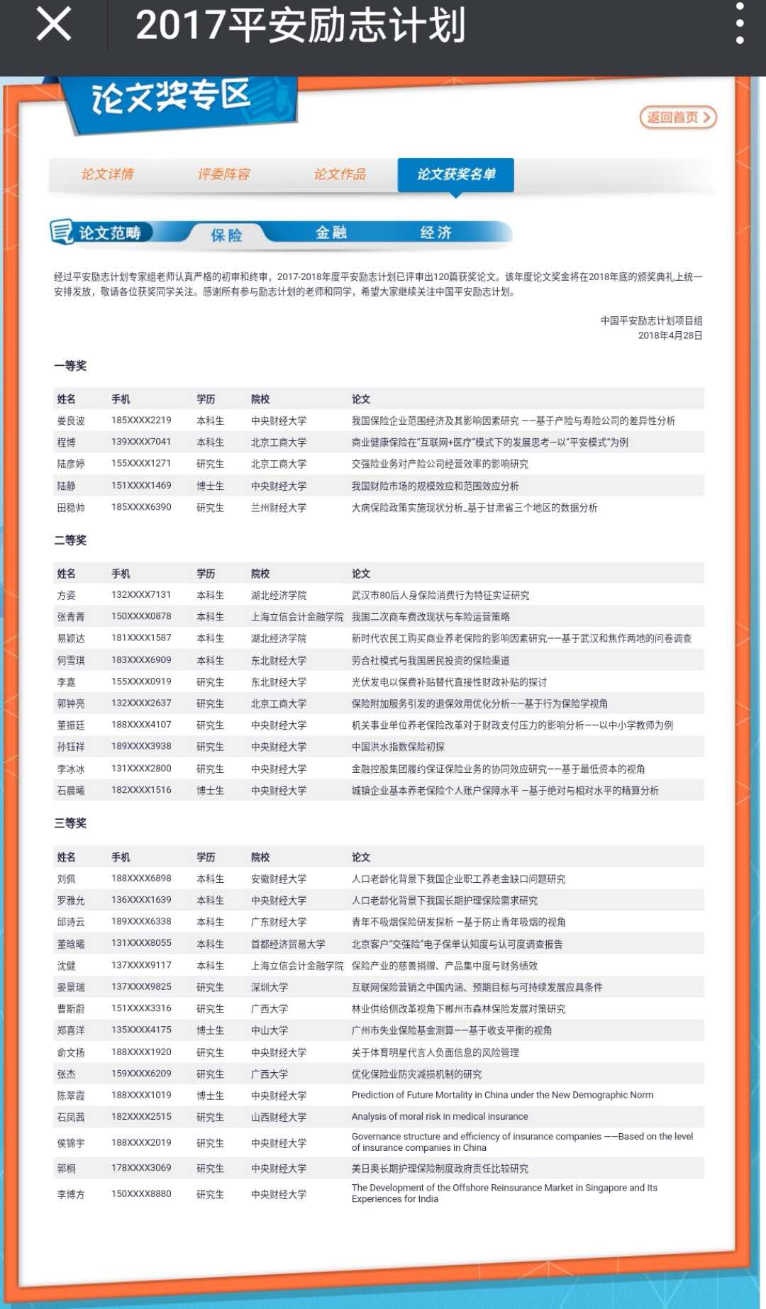 中国平安励志计划学术论文保险组的获奖名额为30篇,其中本科生获奖数量为11篇,研究生(含博士研究生)获奖数量为19篇。此项活动由各高校教授组成的评审组匿名初审及终审,最终确定获奖论文。目前,我国开设保险专业的院校86所,获奖难度较高。今年获奖人数连续保持本项活动自2003年开展以来获奖总数一直遥遥领先的地位,充分体现了必赢nn699net官网重视和支持学生从事专业科学研究工作所取得的成果。