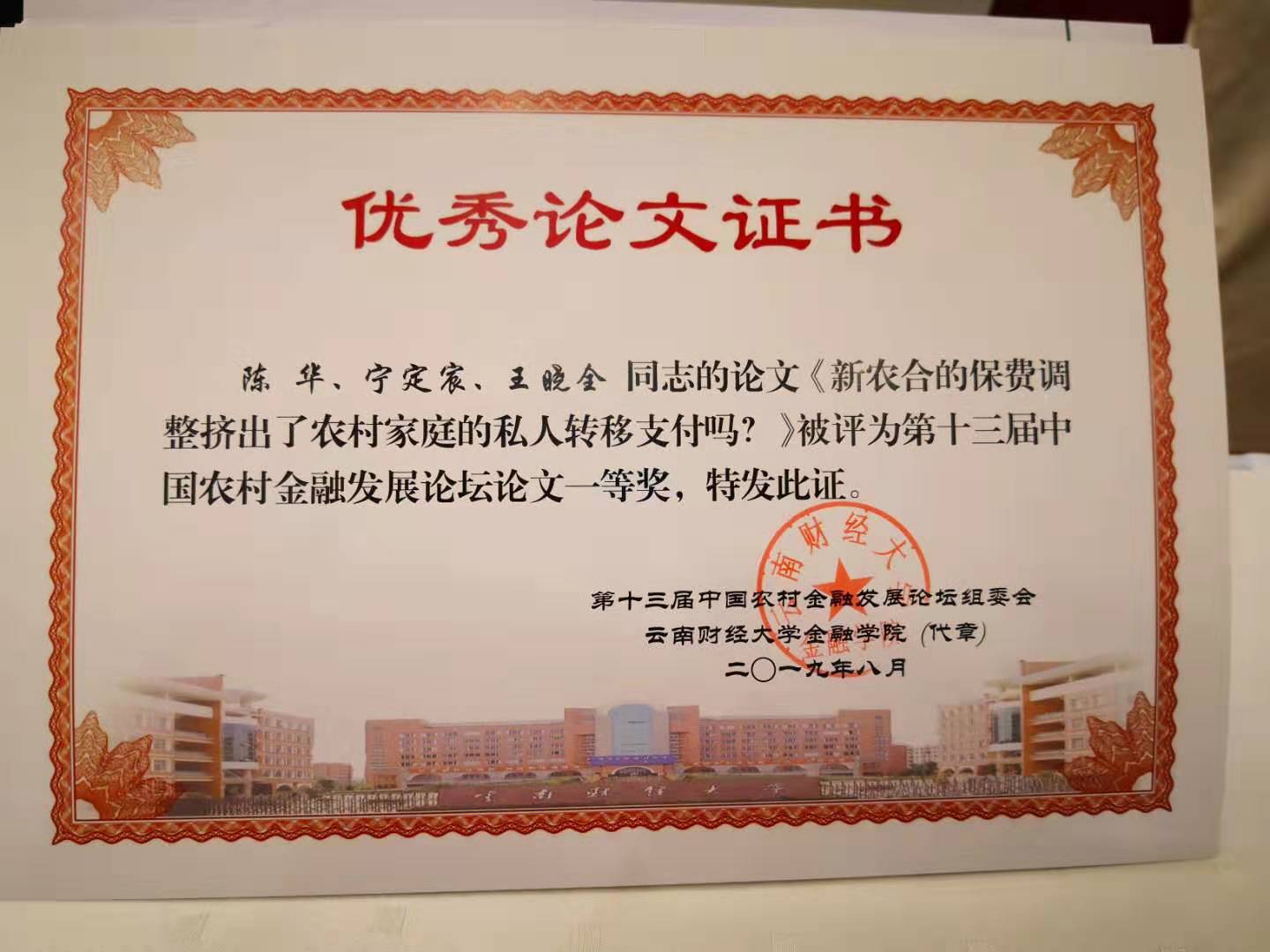 2019年8月24-25日,由教育部高等学校农业经济类专业教学指导委员会农村金融学教研组、中国农村金融教学与科研联盟主办,云南财经大学承办、《中国农村经济》等十余家期刊协办的“第十三届中国农村金融发展论坛”在云南昆明举行。必赢nn699net官网陈华副教授和2018级保险学硕士研究生宁定宸应邀参加了本次会议。本次会议报告和交流的论文多达110余篇。