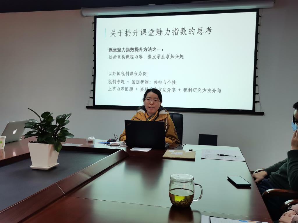 随后,王文静老师分享了提升课堂魅力指数的方式方法和参加青年教学基本功比赛(以下简称“青教赛”)的心得体会。她指出,只有吸引学生的注意力,激发学生的学习热情,才能够让学生主动拥抱课堂。首先要创新重构课程内容,激发学生求知兴趣;其次要组建学习小组,发挥学习集聚效应;第三要注重采用渗透参与式教学模式,强化学生的参与度;第四要深入探索案例教学法,全面启发学生视野;第五要重视对学生学习效果的反馈,增强学生的存在感。她的报告获得老师们的高度评价,老师们获益良多。
