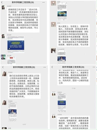 软件学院教工党支部于2022年5月7日组织召开党员学习大会,认真学习宣传贯彻中共中央政治局常务委员会5月5日会议精神。基于疫情防控,本次学习采用的是自行观看的方式,进行过程是:党员同志们先在学习强国上观看视频,然后将学习过程及感想分享到软件学院教工党支部微信群进行交流。软件学院教工党支部28名党员同志积极学习并及时分享学习感想。