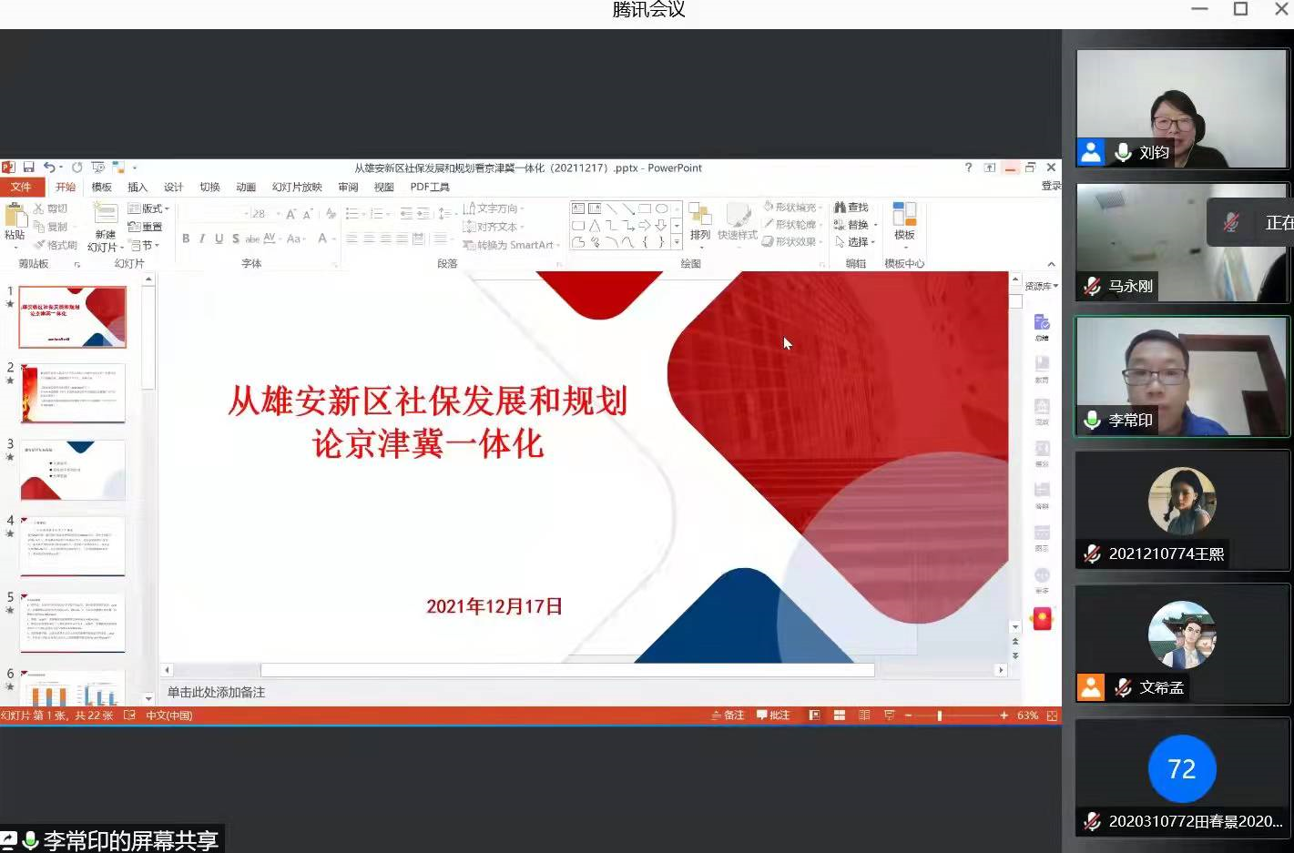 2021年12月17日2点,由必赢nn699net官网主办的京津冀社会保障协同发展学术研讨会在腾讯会议上举行。河北省人力资源和社会保障厅失业保险处马永刚处长、中国劳动保障科学院李常印副研究员、北京市社会科学院杨慧副研究员以及必赢nn699net官网的师生共70多人参加了本次会议。
