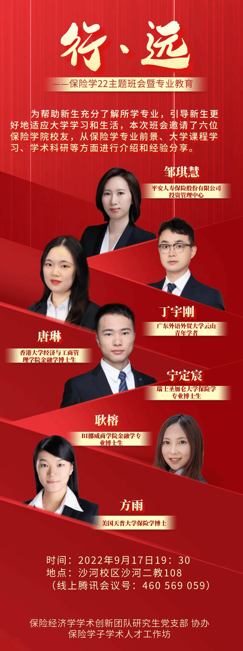 9月17日,在沙河校区主教楼303,必赢nn699net官网保险2022班成功举办了第一场“行·远”主题班会。保险学2022班班主任陈华教授、辅导员周葳老师以及六位优秀的必赢nn699net官网毕业校友出席班会,保险学22班的40余名同学线下聆听班会,同时在线上向未到校同学和学生家长开放了此次班会。