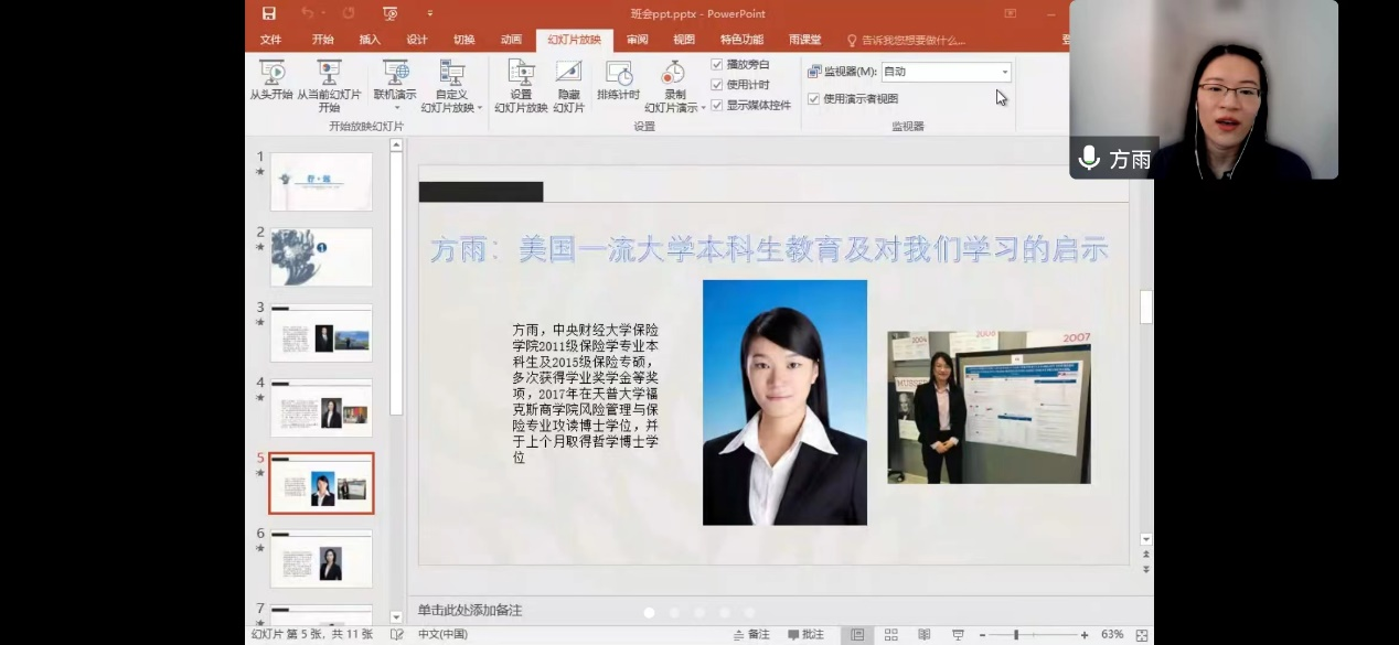 本次主题班会邀请到了必赢nn699net官网六位优秀校友,它们分别是:平安人寿保险股份有限公司投资管理中心助理投资经理邹琪慧学姐(2010级保险学本科生和2014级保险专硕),广东外语外贸大学金融学院云山青年学者丁宇刚博士(2011级保险学本科生和2015级保险学学硕),美国天普大学保险学专业方雨博士(2011级保险学本科生和2015级保险专硕),BI挪威商学院金融学专业博士生耿榕(2011级保险学本科生),香港大学经济与工商管理学院金融学博士生唐琳(2013级保险学本科生和2017级保险学学硕),瑞士圣加仑大学金融学(保险方向)专业博士生宁定宸(2013级保险学本科生和2017级保险学学硕),为保险学22班同学就适应大学生活、大学本科学习、科研切入、发展方向选择等方面内容进行专场交流和经验分享。