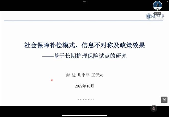 封进教授报告的题目为“社会保障补偿模式、信息不对称及政策效果——基于长期护理保险试点项目的研究”。文章研究的主要问题为社会保障补偿模式对个体是否汇报真实私人信息具有内在激励。封进教授基于我国某个地区的长期护理保险试点,首先从理论上论证了几种常见补偿模式(如实物补偿和现金补偿)对于申请者失能程度高报的激励。再利用典型城市长护险政策和实际运行数据检验了个体高报失能程度的行为。文章稳健地发现,基于特定失能等级的现金补贴有高报激励,使低失能者评为高失能者的概率显著提高7.0-10.3个百分点,异质性分析发现高报问题在初始健康状况较好的群体中更严重。在经过实证分析以后,封进教授提出了两种改进方案,文章的结论说明了完善长护险待遇保障政策的重要性。