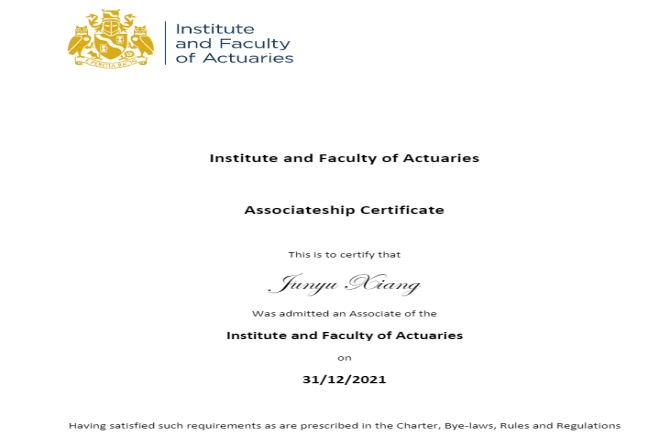 向俊宇,2014级精算本科生,现就职于中国财产再保险有限责任公司精算部。本科期间通过CT1-CT8共8门免试认证,目前通过了SP7、SP8和SA3等高级课程,取得了英国准精算师资格。