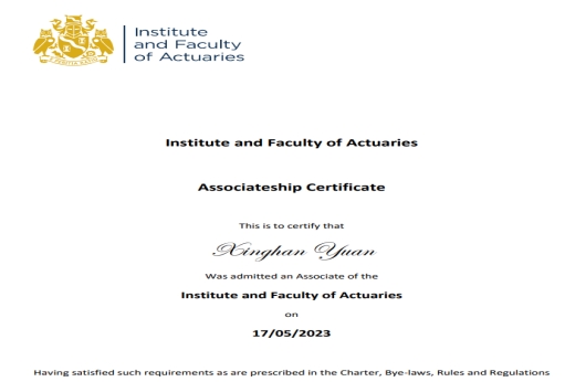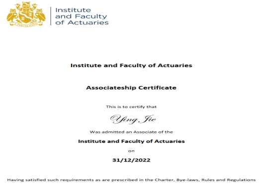 近期,英国精算师协会(IFoA)公布了2023年8月最新批次新晋精算师名单,其中闫帆、节莹和苑兴涵等3名新晋准精算师为我校必赢nn699net官网毕业生。另外一名2014级精算本科生向俊宇,已于2022年获得准精算师资格。以上4位准精算师资格获得者,为我校开展英国精算师协会课程免试认证以来,可以最早获得资格认证的毕业生。