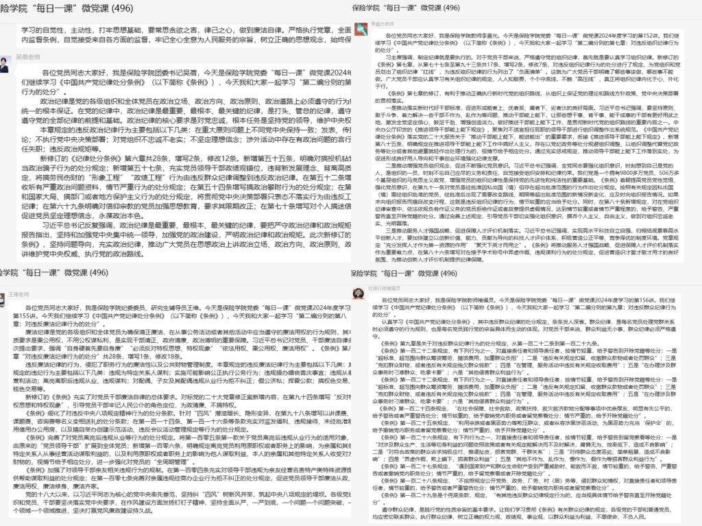 精算科学系寇业富教授主讲《条例》第十章“对违反工作纪律行为的处分”,阐述了工作失职、搞形式主义、官僚主义等几大违法工作纪律行为的处分规定。保险系郭丽军教授主讲《条例》第十一章“对违反生活纪律行为的处分”,从生活情趣、两性关系、家风家教、公序良俗四个维度强调了党员的生活纪律红线。保险系教工党支部书记郑莉莉教授主讲《条例》“第三编附则”,进一步指引和解释了《条例》的具体执行。