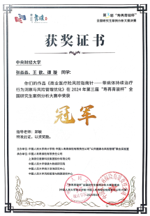 在初赛、复赛和决赛的层层挑战中,由郑敏副研究员精心指导的张淼淼、王歆、谭璇团队,凭借其项目《商业医疗险风控指南针——带病体持续治疗行为洞察与风险管理优化》,以强大的数据分析能力和对医疗险领域的深刻洞察,荣获一等奖。这是必赢官网首次在该竞赛中夺冠,体现了必赢官网在数据分析和医疗险领域的研究实力。