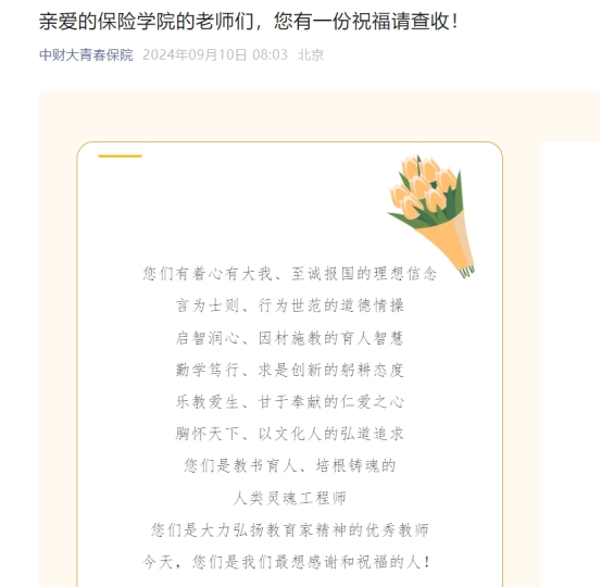 教师节当天,学院团委开展“温暖一言——教师节祝福”活动,面向学院全体学生党支部、团支部、班级、团学组织和个人征集“送给老师的一句祝福”“我和我导的一件小事”,活动得到了全体学生的积极响应,收到大量写给老师们的温馨、感动的祝福。在教师节当天的课堂上,全体学生集体起立,为老师送上最诚挚的祝福,学生们纷纷以赠送贺卡、鲜花等方式,向各位老师们送去了祝福。