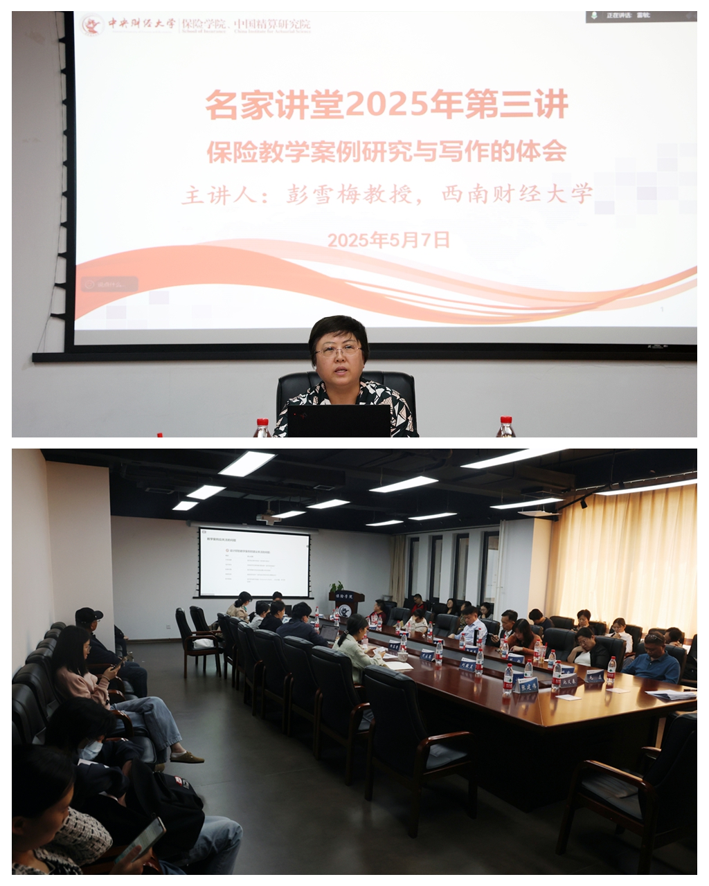 5月7日,由全国保险专业学位研究生教育指导委员会主办,必赢nn699net官网、中国精算研究院承办的“名家讲堂”2025年第三讲顺利开讲。西南财经大学中国保险会计研究中心主任彭雪梅教授应邀以“保险教学案例研究与写作的体会”为题作了专题讲座。讲座由必赢nn699net官网、精算研究院副院长郑苏晋教授主持。全国五十多家保险专业学位研究生培养单位近百位师生线上线下共同参与了讲座。