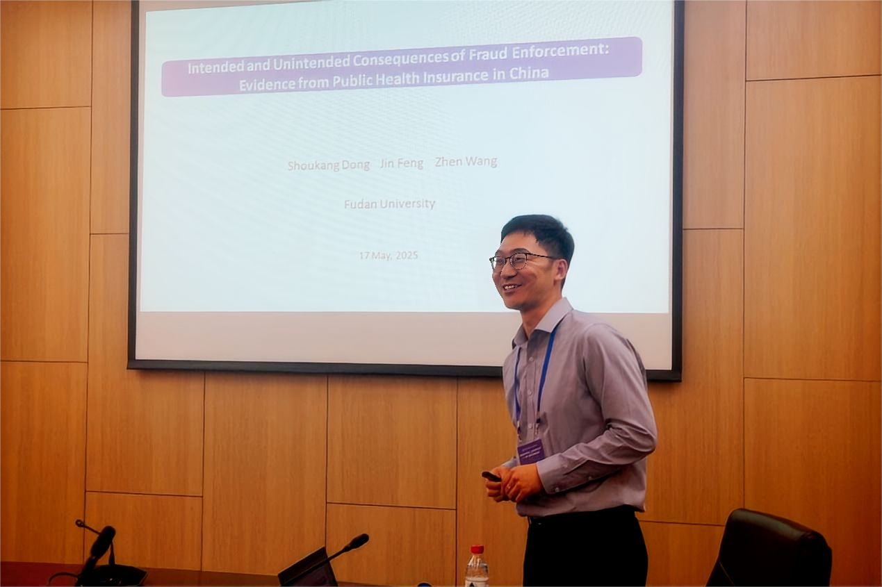 第一位汇报的嘉宾是来自复旦大学经济学院的王贞副教授。王老师报告的题目是《Intended and Unintended Consequences of FraudEnforcement: Evidence from Public Health Insurance in China》,分享了他与合作者利用中国某市医保数据研究医保欺诈审查对减少医保资源浪费和对个体就医行为的影响。