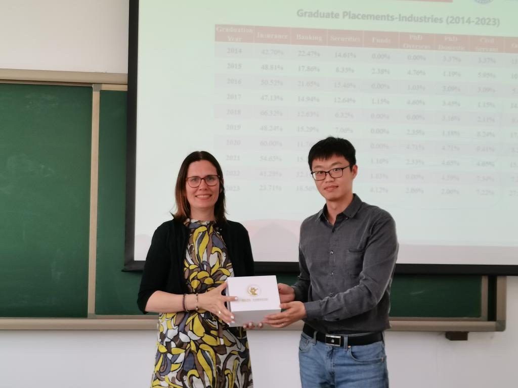 短期课程结束后,必赢nn699net官网、中国精算研究院副院长郑苏晋教授、风险管理与保险系系主任马冰副教授分别向Mierau教授和Angelini教授赠送了学院的文创产品。