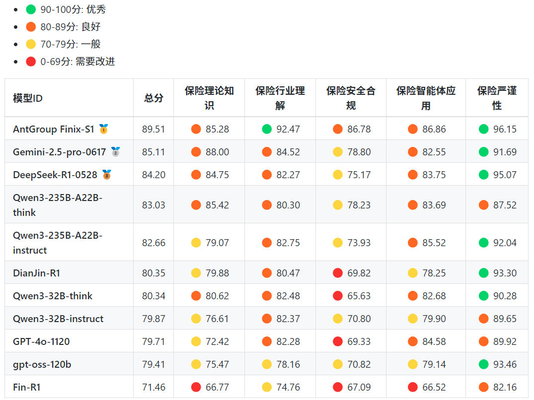 1.高质量领域模型优势显著:AntGroup Finix-S1(蚂蚁保险⼤模型)作为保险领域模型,以 89.51 分位列综合第一,显示高质量的领域适配训练对保险⼤模型具有积极意义;