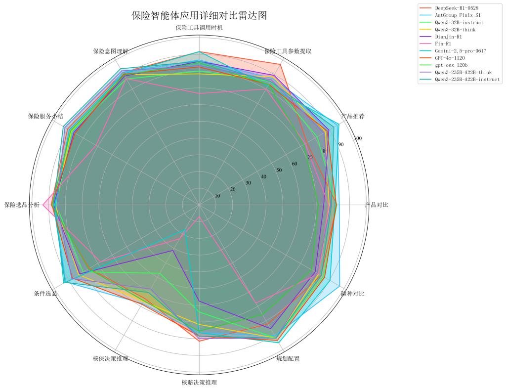· AntGroup Finix-S1以86.86分位列第一,在保险意图理解(91.67分)、产品推荐(95.35分)等关键能力上得分较高