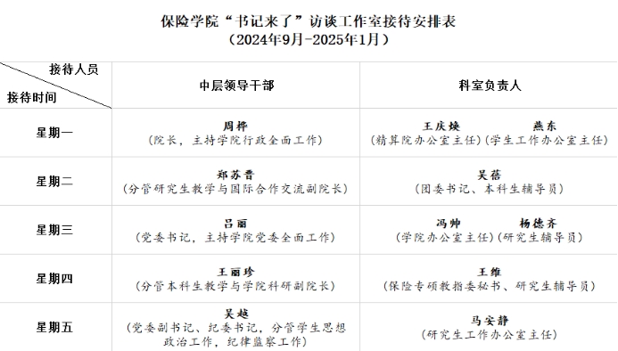 下面是“书记来了”访谈工作室2024-2025学年第一学期的接待安排表,欢迎广大师生共同交流~