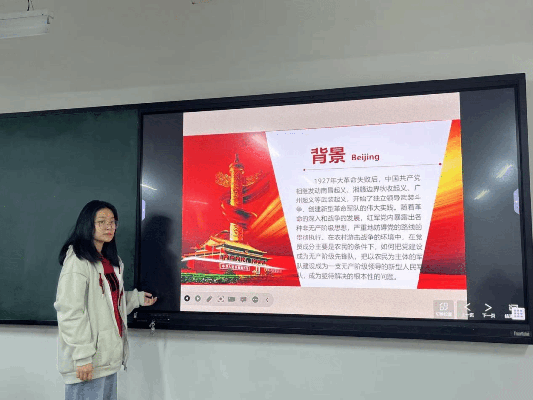 网络空间安全二班的魏嘉琳同学重点介绍了会议的筹备工作:1929年11月26日,朱德、陈毅率领红四军在福建长汀迎接正在养病的毛泽东。苍茫暮色中,三位老战友重逢。这时,中央的“九月来信”已经为红军“政治建军”指明了方向。红四军前委扩大会议决定:部队移师新泉,开展政治整顿和军事训练,为召开红四军党的九大作准备。按照前委分工,毛泽东、陈毅负责政治整顿,朱德负责军事训练。此次整训始终围绕一个目标:党管军队,努力锻造政治更加合格、纪律更加严明、作风更加文明的红四军。