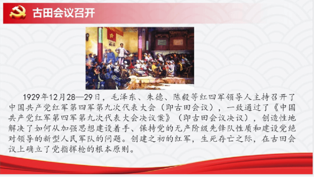 古田会议将马克思列宁主义与中国革命斗争的具体实践相结合,解决了如何从加强党的思想工作着手保持党的无产阶级先锋队性质和建设新型人民军队的根本问题,是人民军队建设史上一次极其重要的会议。会议通过的决议案所规定的红军建设的各项原则,不但在红四军得到实行,随软件工程三班的孙士涵同学首先从古田会议的背景入手,为同学们能进一步了解古田会议做出铺垫:1928年4月,毛泽东率领的工农革命军与朱德、陈毅率领的湘南起义部队在井冈山胜利会师,合编为工农革命军第四军,5月改编为中国工农红军第四军,简称红四军,朱德任军长,毛泽东任党代表,陈毅任政治部主任。11月,红四军前敌委员会成立,毛泽东任书记。随后,红四军在朱德、毛泽东、陈毅等领导下,打破了敌人对井冈山革命根据地的多次围攻,并于1929年1月起向赣南、闽西进军,开创了赣南、闽西革命根据地,奠定了后来的中央革命根据地的基础。