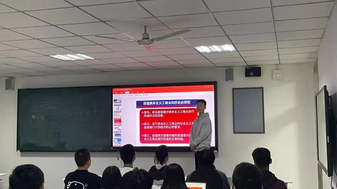软件工程四班的张钊硕同学讲到了政治原因是对资本主义工商业进行改造的决定因素,其次,实行资本主义工商业的社会主义改造是推行计划经济的必然要求。资本主义工商业的社会主义改造分为:改造资本主义工商业的必然性、改造资本主义工商业、改造资本主义工商业的基本经验、改造资本主义工商业遗留问题。
