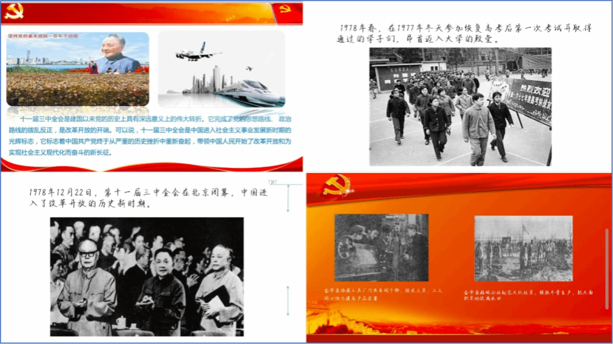 软件工程4班万劲羽同学就“解放思想,实事求是”的精神内涵,向同学们重申了时代精神的重要性;软件工程5班朱朝敬详细介绍了1978年-1988年这十年间中国在企业、文艺方面取得的进步,并进一步解释了改革开放对中国的意义。党的十一届三中全会结束了粉碎“四人帮”后党和国家工作在徘徊中前进的局面。党在思想、政治、组织等领域的拨乱反正从这次全会开始全面展开,我国的改革开放由这次全会揭开了序幕,邓小平理论也逐步形成和发展起来。