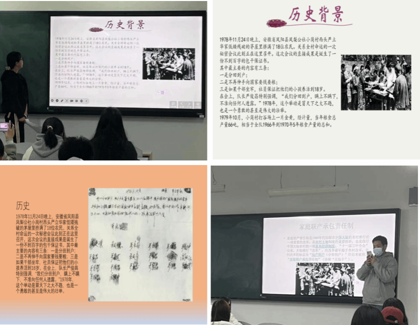 同学们都认真聆听着演讲同学的发言,积极地与演讲同学互动,深刻体会了家庭联产承包责任制对于新中国改革开放初期的重要意义。