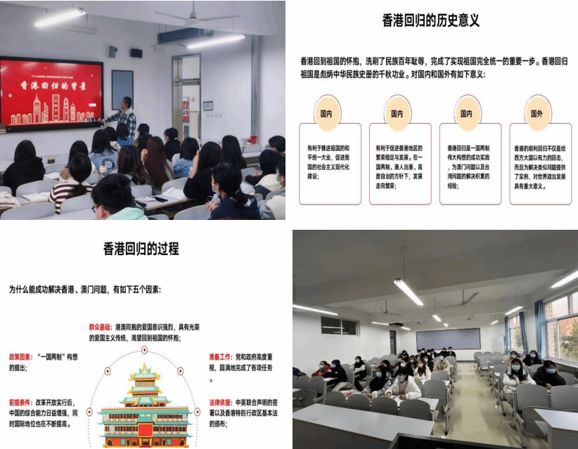 经过此次四史教育的学习,同学们对“香港回归”有了更深层次的了解,懂得了学习四史的意义。“四史”学习教育要把握正确方向、创新内容形式,充分发挥红色资源优势,做到有声有色、入脑入心。我们应把“四史”学习教育与做好当前工作紧密结合起来,从历史中汲取精神力量、汲取经验智慧、汲取坚守人民立场的定力,坚定不移做好自己的事情,更好推动改革开放再出发,更好增进人民群众福祉。