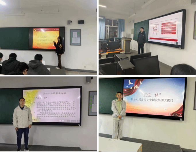 2022级软件工程5班郭泉结合五位一体的经济出发点与自己的意见作出了未来的展望,2022级软件工程6班刘欣然详细解释了五位一体的长远目标。党的十八大首次提出中国特色社会主义事业总布局是“五位一体”。党的十九大进一步作了明确和重申。“五位一体”总体布局是一个有机整体,经济建设是根本,政治建设是保障,文化建设是灵魂,社会建设是条件,生态文明建设是基础,统一于把我国建成富强民主文明和谐美丽的社会主义现代化强国的新目标。