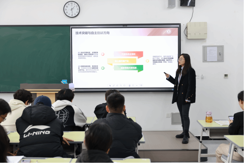 马克思主义学院王晴老师从一件血衣讲起,深入剖析了辛亥革命在政治变革、思想解放等方面的深远意义,并结合党的二十届四中全会精神,梳理辛亥精神在全面建设社会主义现代化国家新征程上的价值体现。网络空间安全辅导员罗棉心老师结合网络空间安全专业的特色,结合“华为海思备胎计划”“零信任架构”“AI安全治理”等数字领域发展成果,围绕“技术创新、跨域协作、法治伦理、国家使命”四个维度,号召同学们在算法攻防、数据守护、系统构建中锤炼本领,筑牢国家网络主权防线。