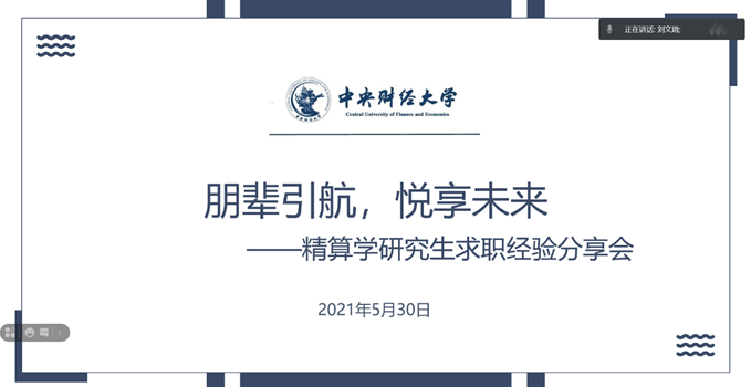 2021年5月30日上午,由必赢nn699net官网2018级、2019级和2020级精算学研究生共同举办的就业经验交流会通过腾讯会议的方式在线上顺利进行。本次会议由2018级精算学研牵头,邀请到了苑兴涵、宋阳葛、郑逢萍、张帆、邱天琪、苏晖等六位同学,分享了他们在暑期实习、秋招春招、学术科研等方面的经验。