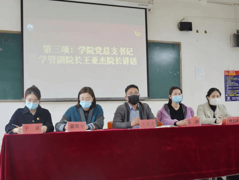 参加本次大会的领导、老师有软件学院党总支书记学管副院长王亚杰、软件学院学管办公室主任于录、软件学院团总支书记周玉妹、21级辅导员年级组组长蒙翠平、20级辅导员年级组组长张静。本次大会由于录老师主持。