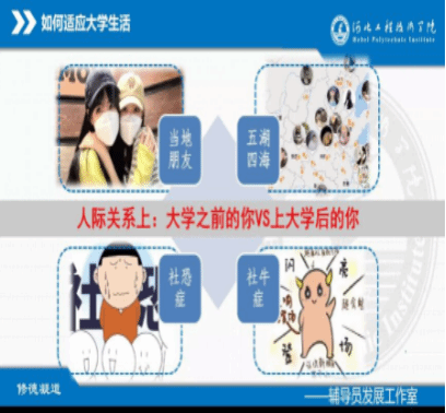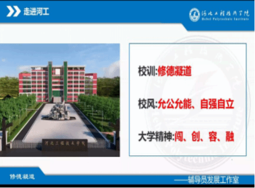 辅导员首先进行了详细的自我介绍,使同学们对辅导员有一个初印象。本次主题班会围绕“走进河工”“适应大学生活”“奋斗河工”三个模块开展。在走进河工的开始,辅导员先通过视频以及讲解让同学们了解了河工的校训、校风、大学精神,增强了同学们的知校爱校荣校意识。接着通过大学前生活和大学后生活的对比,使同学们了解到高中和大学在学习方式、人际交往等方面的不同之处。