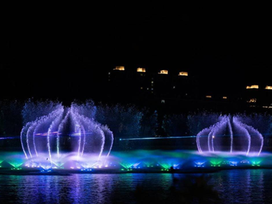 大激店镇的音乐喷泉由专业水景公司打造。聘请重量级导演、作曲家、舞美艺术家、行业技术专家及国内顶尖设计及艺术团队量身定做。采用国家先进专利产品,在体现高艺术性作品的同时保证项目设备高规格品质。夜幕降临,伴随律动,灯光闪烁,水柱涌出水;如少女般舞动,火泉演绎着水火交融的景观,瞬间爆鸣声响起,气爆的水柱直冲云霄;水膜徐徐开放,像是一片盛开的花海;冷雾把水面装饰的如仙境一般,激光照射在上面更是增加了几分神秘。水舞表演艺术而灵动,表演变幻多姿,如梦如幻。既轻缓柔美又高亢激情,艺术美感直击观众内心。