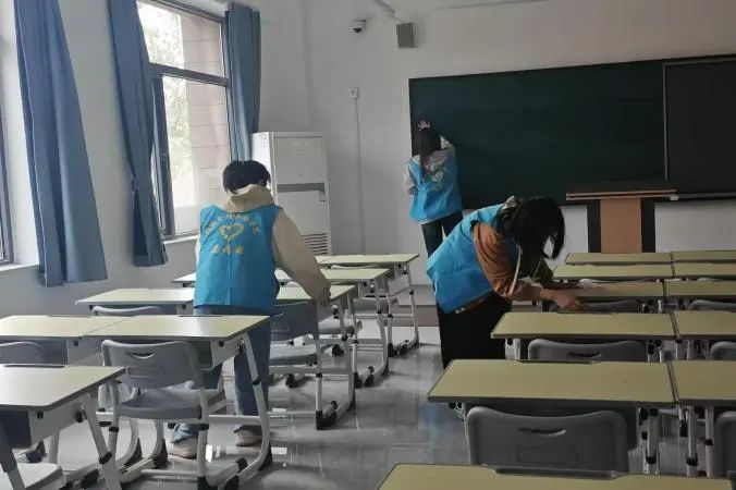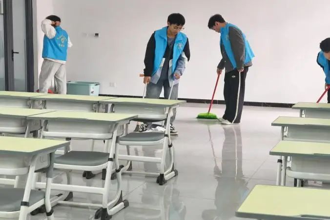 活动当日,身穿蓝色马甲的志愿者们在7号楼集合,进行分配小组任务,划分楼层卫生区域,小组成员分工明确,配合默契。当志愿者们进入教室后,有的志愿者手持扫帚,仔细清扫地面的灰尘和垃圾;有的志愿者则是专注于擦拭桌椅,将每一张桌子、每一把椅子都擦拭得一尘不染,再将它们回归原位;还有的志愿者负责清理黑板、窗台和墙角的污渍,他们用清洁剂和刷子,一点一点地将顽固污渍清除干净。