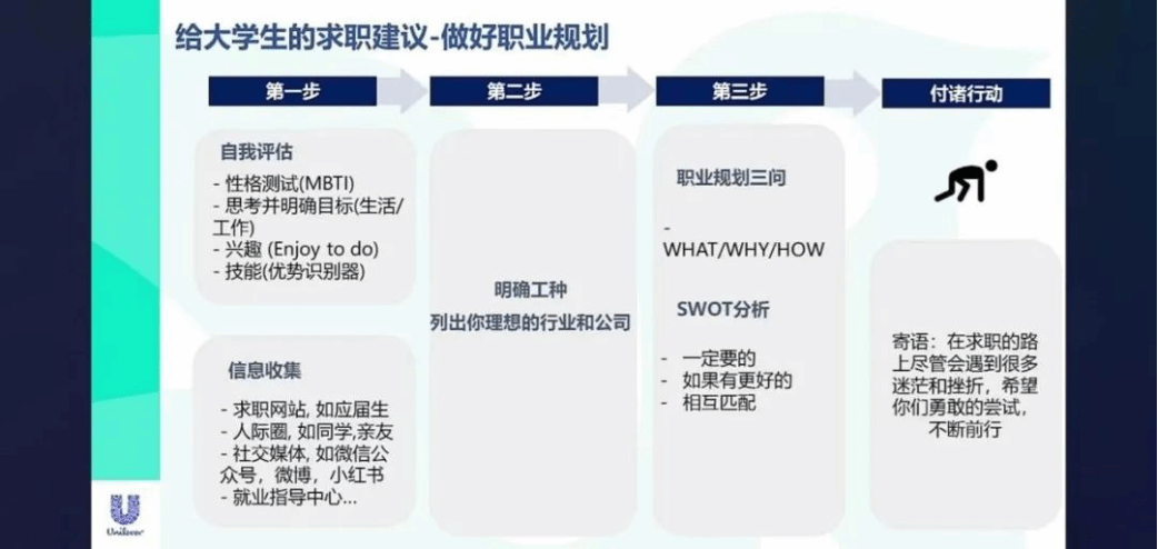 联合利华人才和组织发展总监周蓓黎给予大学生就业建议,应付出行动、投递简历、不断反思以及不断的尝试等等。