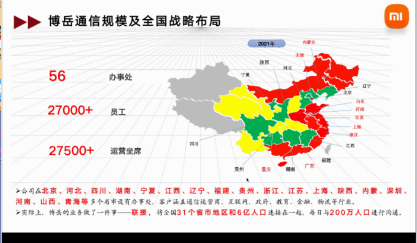 博岳公司在北京、河北、四川等多个省市设有办事处,客户涵盖通信运营商、互联网、政府、教育、金融、物流等行业,合作的公司包含中国移动、小米等多家公司。