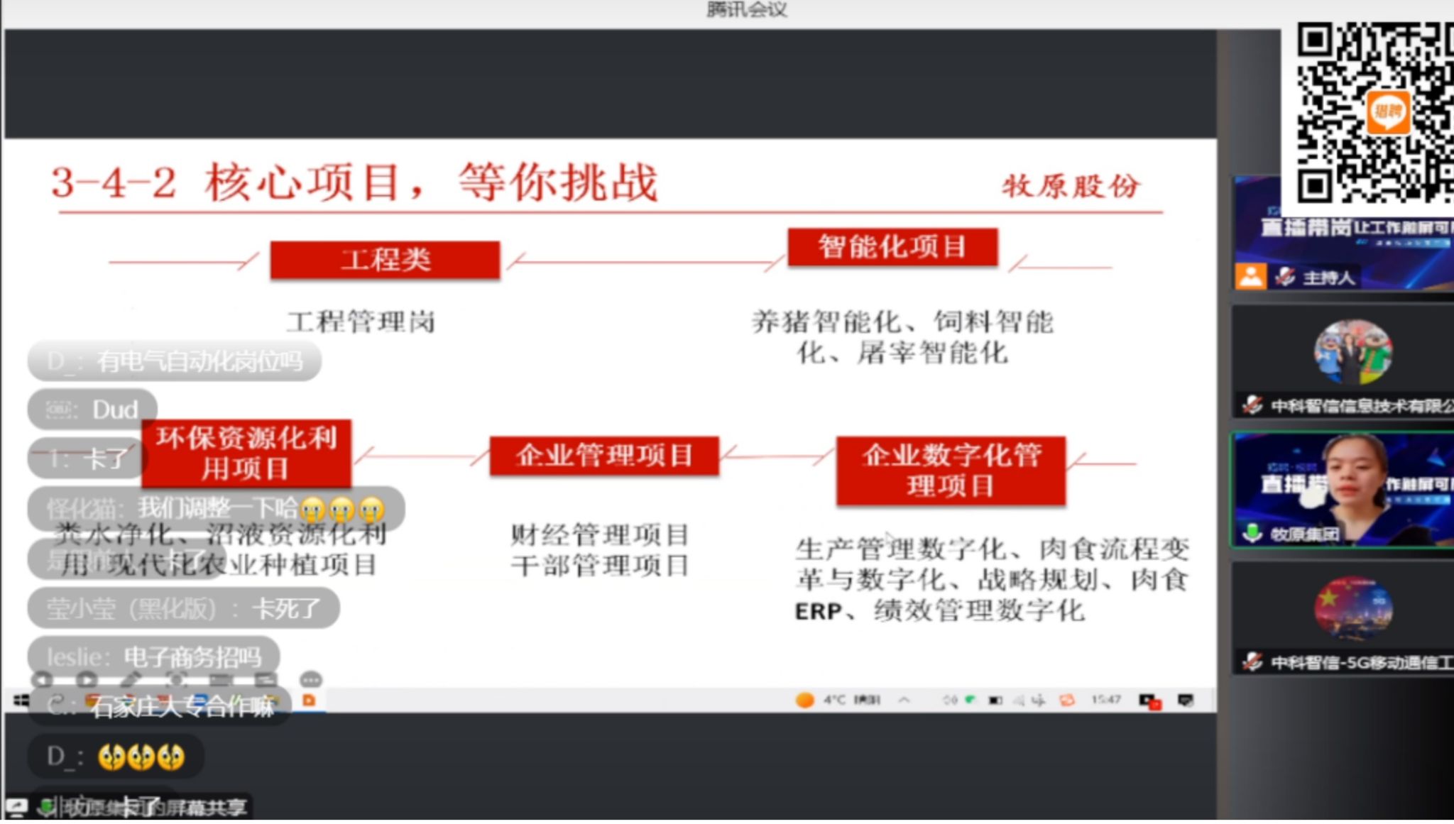2.2022年12月14日15:00组织beat365官网2023届毕业生参加校聘线上招聘宣讲会,主题:让工作触“屏”可及。本场招聘会邀请:中建六局华南公司、牧原食品股份有限公司、中科智信信息技术有限公司三家公司进行宣讲。其中,牧原食品股份有限公司和中科智信信息技术有限公司所招聘岗位与beat365官网开设专业相关。