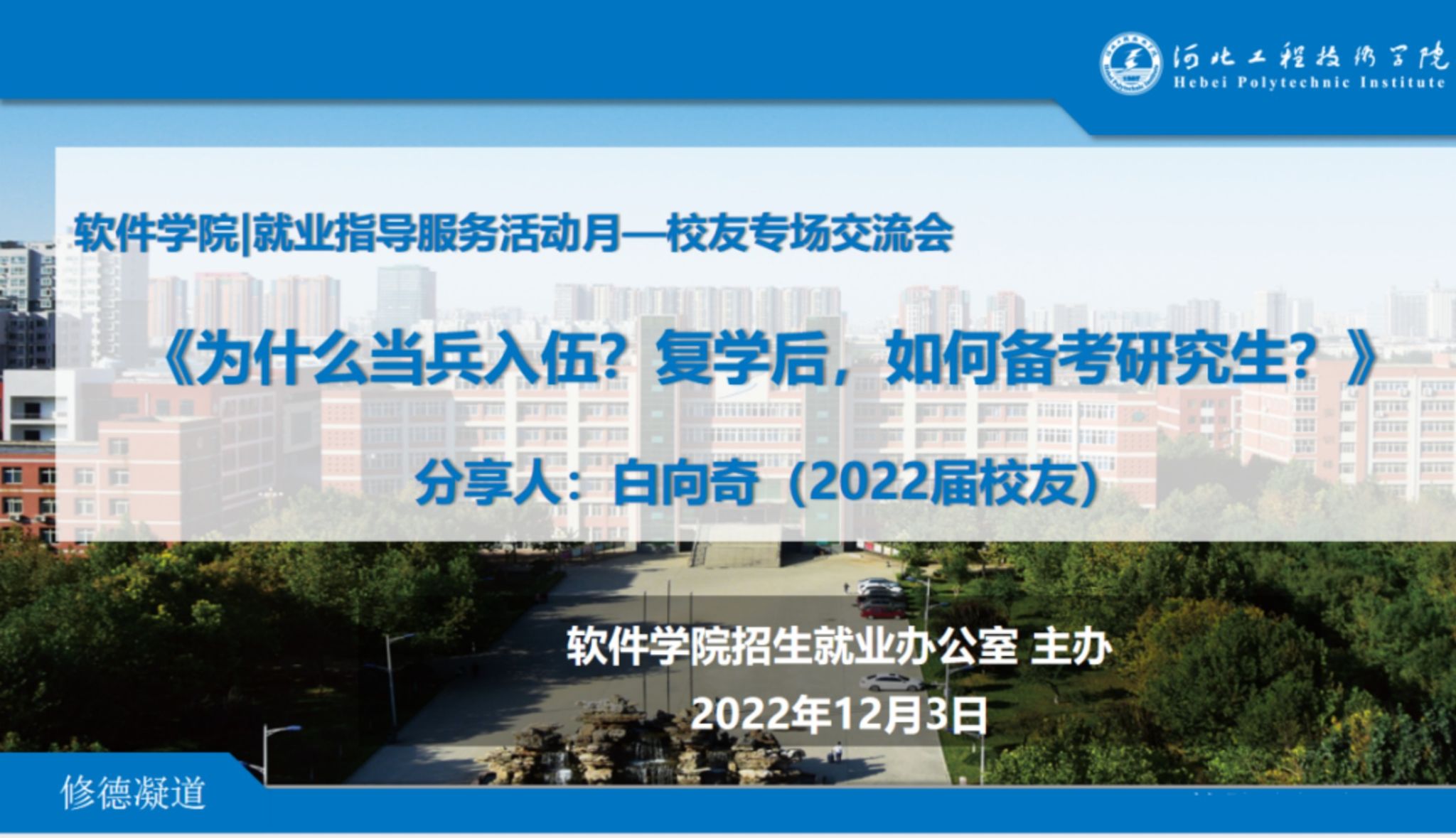 1.在就业指导服务活动月期间,学院特意邀请2022届优秀校友白向奇与学生分享交流。2022届校友白向奇作为退役士兵,复学后在校期间表现优异,先后取得国家奖学金、国家励志奖学金、“三好学生”、优秀学生干部等荣誉称号,后经过自身努力,应届考入中南林业科技大学研究生。校友交流会于12月3日晚19:30在线上开始,围绕《为什么入伍参军?退役复学后,如何备考研究生》主题展开。